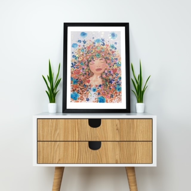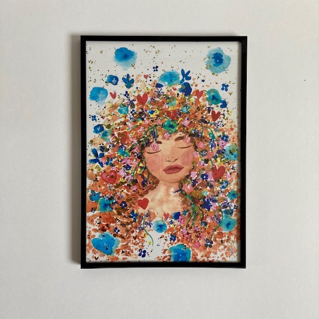 Impression d’une œuvre originale réalisée à l’aquarelle en 2020 représentant une femme à la chevelure fleurie.